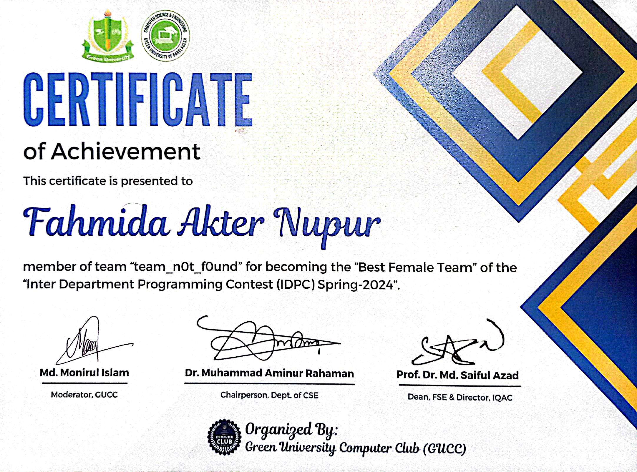 Secured the Best Female Team of Inter Department Programming Contest (IDPC) Spring 2024 at Green University of Bangladesh.