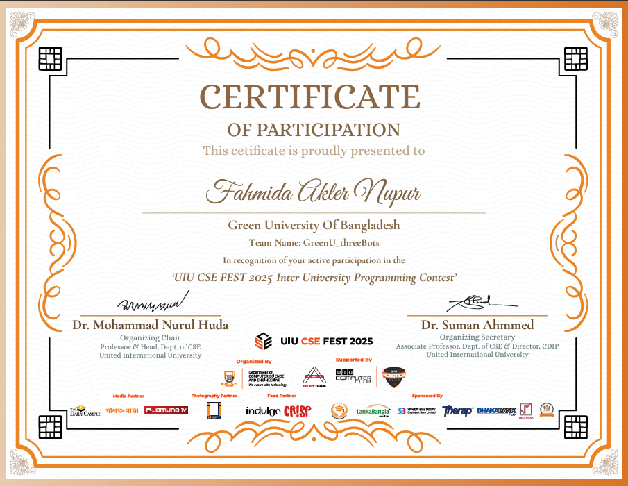 Participated in the Inter University Programming Contest (IUPC) 2025 at United International University (UIU).